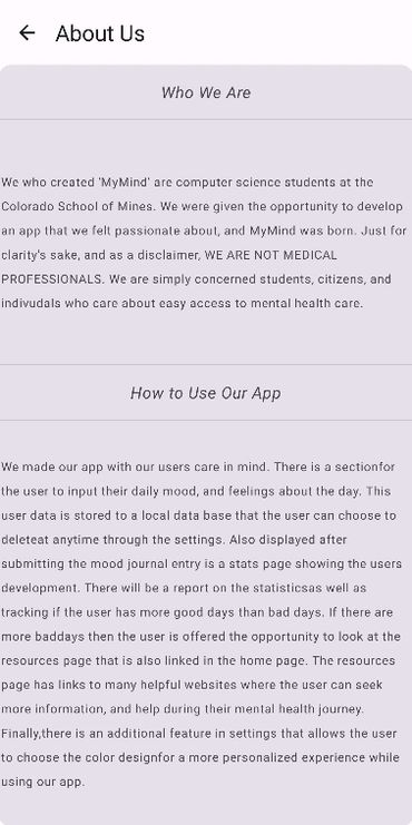 The information screen tells the users about the creators of MyMind and offers a disclaimer stating that the creators are NOT HEALTH PROFESSIONALS, but rather that we are just concerned citizens who care about the current state of mental health. This screen also provides a run down of how the app works and how it is intended to be used.