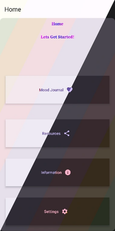 The home screen is the first place our users will be brought to upon opening the app. From there the user will be able to select several other screens to navigate to including: settings, mood journal, resources, and the information screen.