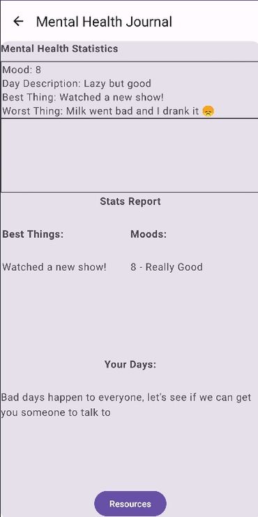 On this page they can scroll through the database of all of their entries and their best days and their mood descriptors for each day. This screen also tracks if the user has had more good or bad days, and if the user has had more bad days a link to the resources page appears at the bottom of the page for more ease in assisting the user to get the help they may require. When hitting the back arrow from this stats screen the user is taken back to the home page.