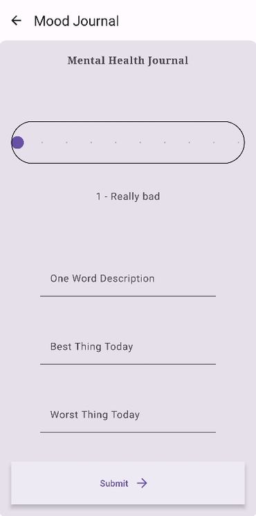 The mood journal allows the users to input their mood for the day using a sliding scale from 1 - 10 with short descriptors for each number. The user will also be able to describe their day in one word, the best thing in their day, and the worst thing in their day. After each has been answered the user will hit the submit button on the bottom of the journal screen where they will be redirected to their stats page.