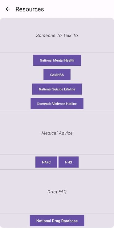 The resources screen has numerous links that the user can click on to be redirected to in order to further themselves on the path to seeking help. These links include
