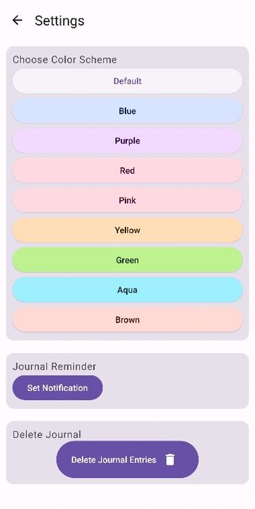 The settings screen allows the user to choose their own color scheme to make the app more their own, and makes it feel a little more personal. The user also has the ability to set alarm reminders that can help to keep them consistent with their journal entries. There is also the ability to delete all prior entries that the user made from that data base, and when they click this they are taken to the stats screen to show that they no longer have any data in their journal.